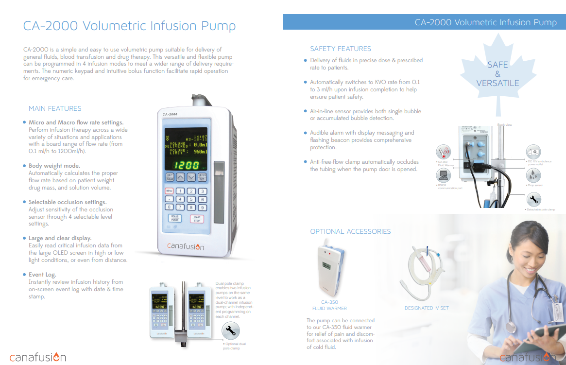 Bơm truyền dịch CA-2000 được thiết kế đơn giản và dễ sử dụng, phù hợp cho việc truyền dung dịch và thuốc. Đặc tính đa năng và linh hoạt của bơm với 4 chế độ truyền khác nhau.