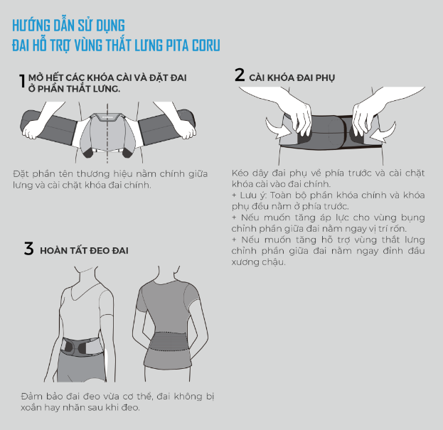 Đai hỗ trợ vùng thắt lưng PITA CORU hỗ trợ cố định vùng thắt lưng bị đau, làm giảm các cơn đau nhức và phòng tránh đau thắt lưng mãn tính từ giai đoạn đầu (bản STANDARD); hỗ trợ điều trị các cơn đau thắt lưng dai dẳng (bản WIDE). Sản phẩm nhẹ, bền, thoáng khí, êm ái mang lại cảm giác dễ chịu nhất cho người dùng.