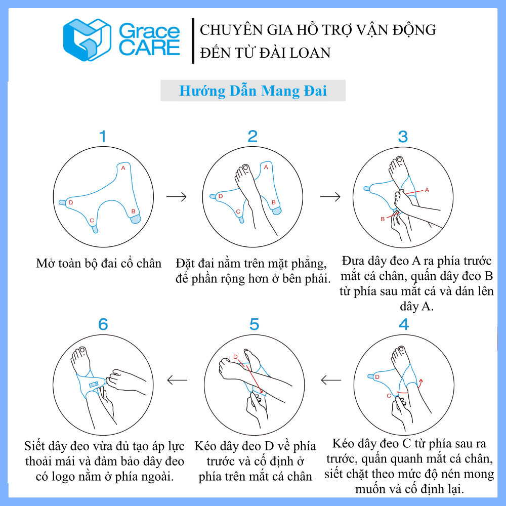 Đai cổ chân Grace Care AB222 hỗ trợ cố định và bảo vệ cổ chân khi vận động mạnh, giảm nguy cơ chấn thương và hỗ trợ phục hồi sau bong gân, trật khớp – thiết kế mỏng nhẹ, dễ điều chỉnh và thoải mái khi sử dụng.